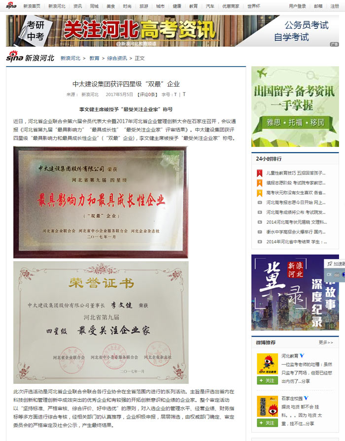 新浪網報道了“中太建設集團獲評四星級“雙最”企業”
