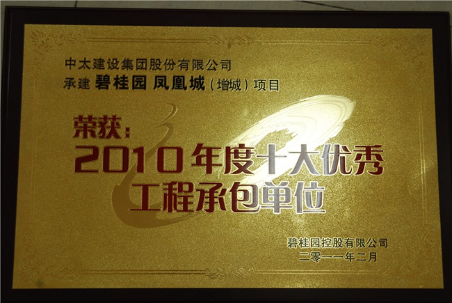 中太建設集團廣州工程一局鳳凰城項目部被碧桂園集團評為“2010年度十大優秀工程承包單位”
