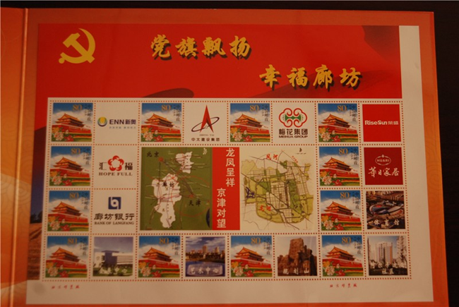 6月3日上午,由廊坊市委宣傳部與廊坊市郵政局共同推出的《黨旗飄揚 幸福廊坊》個性化郵票在廊坊市博物館舉行首發式。《黨旗飄揚·幸福廊坊》個性化郵票共“1+12”幅圖案。“1”即中心主圖案,體現廊坊市“龍鳳呈祥,京津對望”的區位優勢,“12”即12幅輔圖,其中4幅分別為會展中心、居民小區、文化藝術中心、中央生態城,體現“智能、生態、商務、休閑”的廊坊