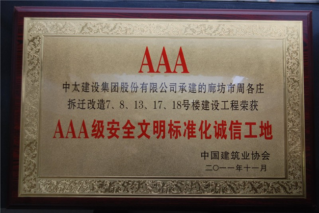 近日,中國建筑業協會發布2011年全國 AAA級安全文明標準化誠信工地評定名單,中太建設集團承建的廊坊市周各莊拆遷改造7、8、13、1718號樓建設工程獲評2011年全國 AAA級安全文明標準化誠信工地。