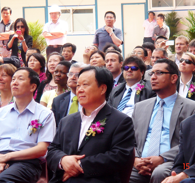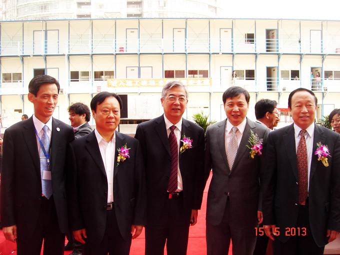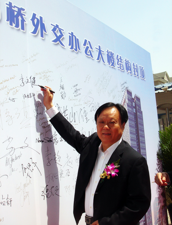2013年5月15日上午,伴隨著最后一方混凝土的成功澆注,在50余名駐華外交使節(jié)以及外交部、北京市等有關(guān)部門代表的見(jiàn)證下,由集團(tuán)公司第八工程局承建的亮馬橋外交辦公大樓工程正式實(shí)現(xiàn)主體結(jié)構(gòu)封頂。董事局主席李文健(左一)應(yīng)邀出席儀式。