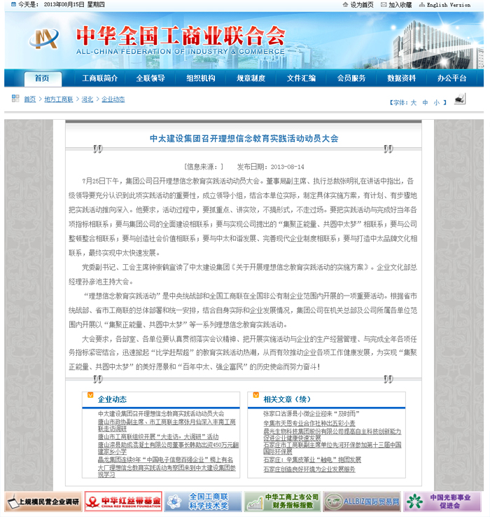 全國工商聯網站8月14日報道了中太建設集團召開理想信念教育實踐活動動員大會
