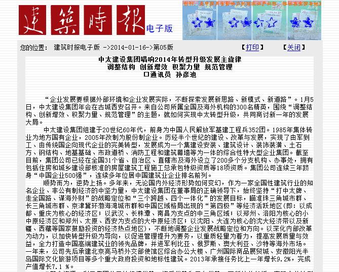 建筑時報2014年1月16日報道了中太建設集團唱響2014年轉型升級發展主旋律