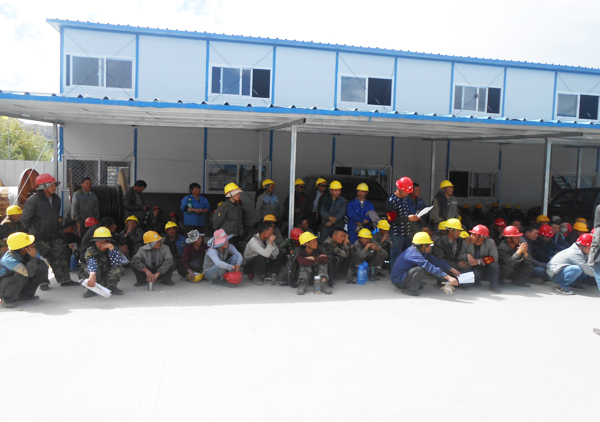 為了不影響現場施工,這次教育活動被安排在午休時間。烈陽高照,數百名工人整齊地排坐在拉薩指揮部大院,接受項目經理高進來的安全知識培訓。培訓過程中,高經理首先親自示范了佩戴安全帽的正確方法,并講解了“安全三寶”的重要性,從“安全意識”到“三不傷害”,從“臨邊洞口防護”到“用火用電”,從“特殊工種”到“塔吊等大型機械”,最后也講到了生活區安全管理和環境衛生。高經理從廣大職工切身利益的角度出發,對一線安全生產須知進行了生動形象的描述。隨后,安全部負責人王子成針對施工現場的薄弱環節和安全隱患,也向現場工人提出了若干點安全要求,引起了在場工人的高度重視。