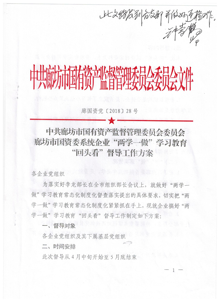 [2018]5號關于轉發《廊坊市國資委系統企業“兩學一做”學習教育“回頭看”督導工作方案》的通知